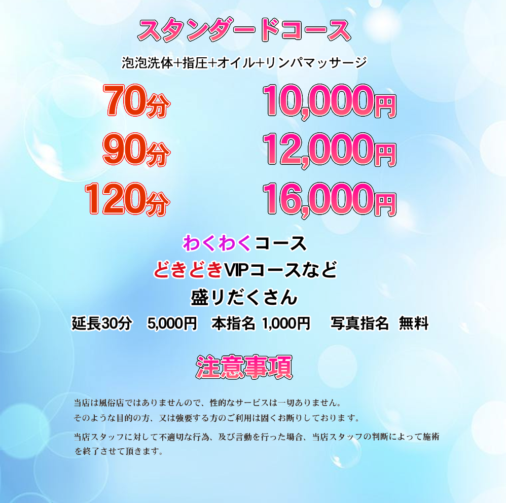 指圧、ストレッチ、アロマ・トリートメント(パウダー)、リンパ・マッサージ、泡洗体